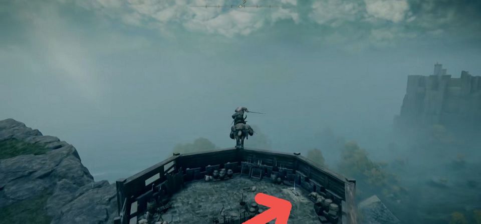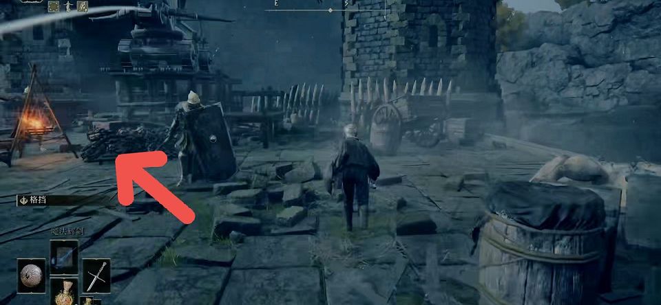 继续沿主路行驶左侧会有一个篝火,篝火的旁边就是新的赐福点,激活之后就来到旁边的气流上面,对准前面的高塔在气流里面点击跳跃按键,这样就可以直接飞上高塔了,亮着紫色的光的就是百分之百防御的乌龟盾,获取之后就可以传送到初始之地了(乌龟盾需要14点力气才能使用)。