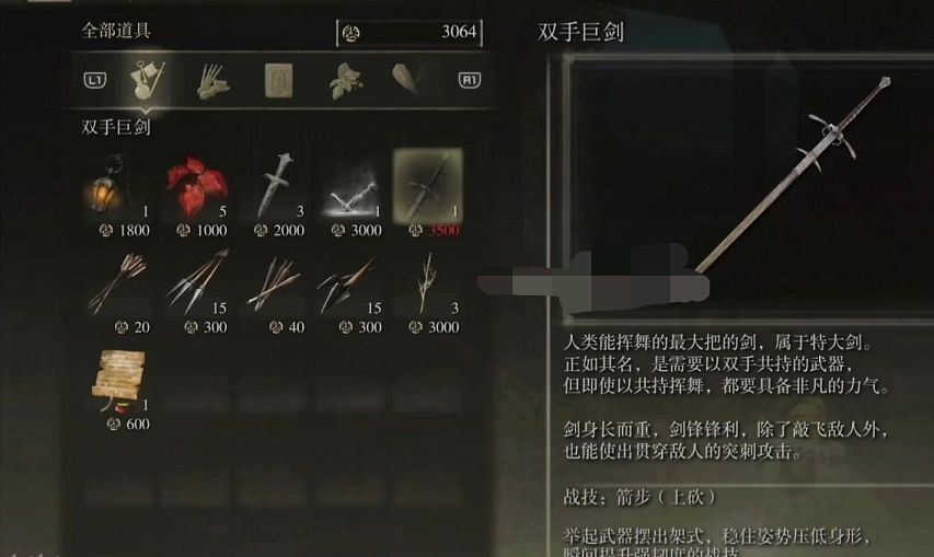 这把大剑基本上就是左右各一把,L1本身的攻击会同时舞动两把武器,双持大剑的精髓在于跳跃L1,这招削韧效果也非常高,往往打个3~4下,就能打出很多boss的硬直效果,而且伤害十分可观,跳跃攻击是所有近战武器中出手速度相对比较快的,获取地点在摩恩城城墙前方。