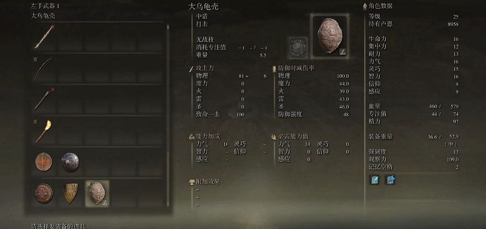 这也是前期开荒最推荐大家使用的一件防具,虽然很多用户在前期开荒的时候基本上不带盾牌,但是这面盾牌确实非常好用,物理减伤和48的防御强度,外加提升精力回复速度的能力,获取地点也在摩恩城墙前方。
