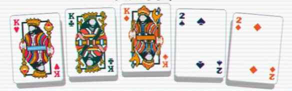 三条及对子,即2张点数相同的牌与另外3张点数相同的牌一同打出。