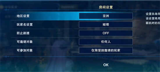 2、之后是房间设置,我们可以在这个页面中设置地区设置、玩家名设置、防止剧透、可邀请对象、可参加对象。