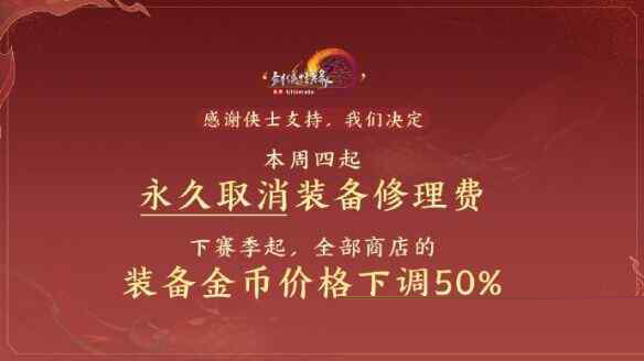 剑网3装备修理费永久取消了吗?剑网3装备修理费在本周四3月14日开始永久取消,并且在下个赛季会对商店装备金币价格下调50%,是非常重大的更新。很多玩家都还不知道剑网3装备修理费永久取消了吗?接下来小编就带来详细的剑网3装备修理费永久取消相关介绍。