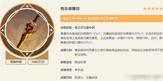 赤角石溃杵也是一把低白值,高暴击伤害副词条的武器,被动能根据防御力来提升普攻和重击的伤害,完美适配需要防御力的角色,是荒泷一斗和女仆的毕业武器。这把武器也是强度不错,但是偏冷门的类型,真正抽取的玩家很少,很稀有的一把武器。
