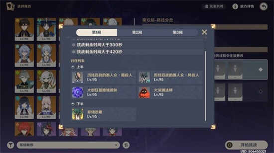 注:本期深渊可以使用两个配队进行通过。上半建议带聚怪角色,如果没有,请参考上文描述的聚怪方法。下半配队较为开放,胡桃、宵宫、林尼、娜维娅、雷神、一斗、草神均可。