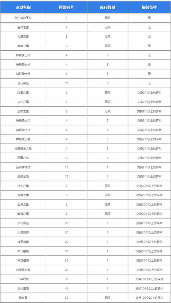 天之碎片可兑换道具