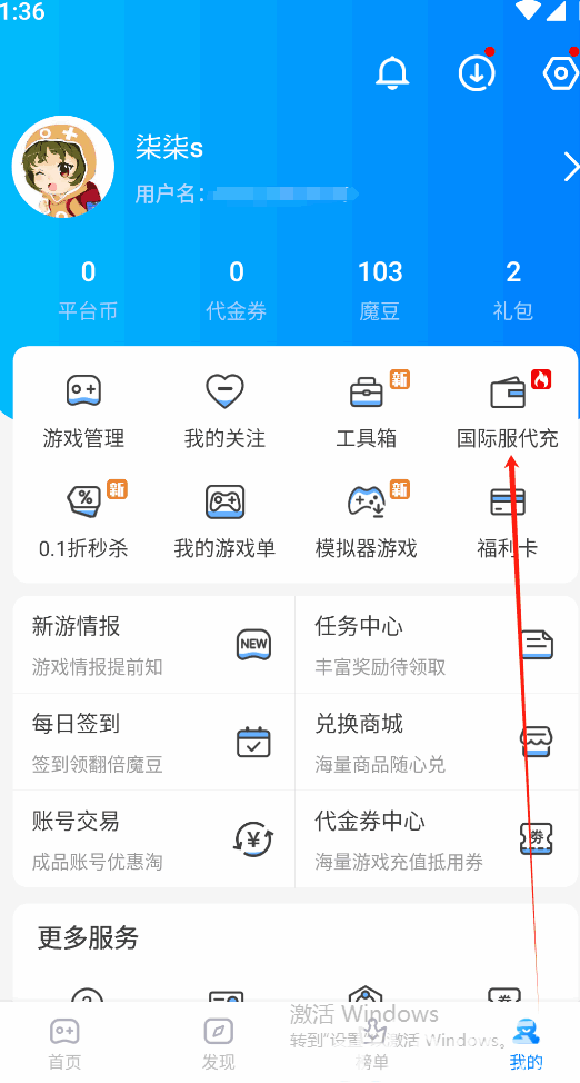 2、下载后需要进行登录,点击“我的-国际服代充”