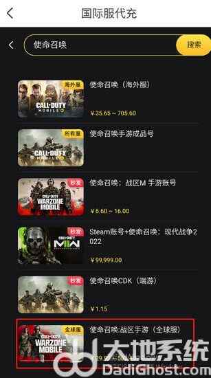 3、进入“国际服代充”后,在搜索框输入“使命召唤:战区手游”即可点击充值了。
