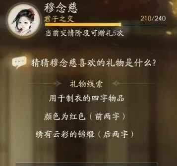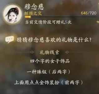 射雕手游穆念慈喜欢的礼物是什么?射雕手游中为玩家们带来了全新的3D开放世界,在游戏中玩家们可以进行自由冒险探索,在这里还可以结交到很多金庸笔下的侠士,在游戏中结交侠士可以通过赠送礼物的方式提高侠士的好感度,在游戏中关于穆念慈喜欢的礼物有哪些是很多玩家都好奇的,接下来就让小编带来穆念慈喜欢的礼物线索大全分享。