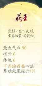 1、药王:奶妈首选,天赋增加气血,增加根骨和体魄,还增加下品治疗类心法的基础效果