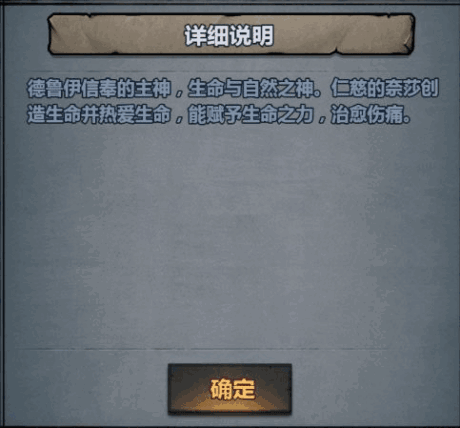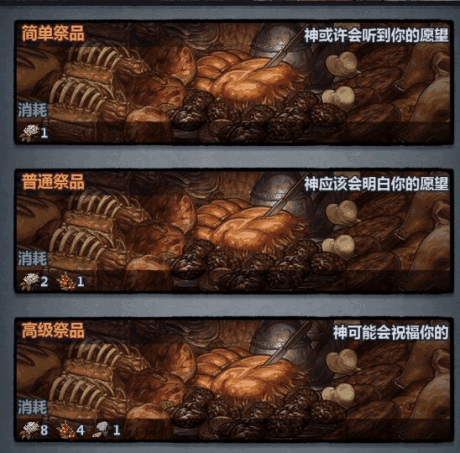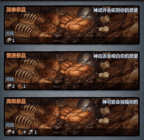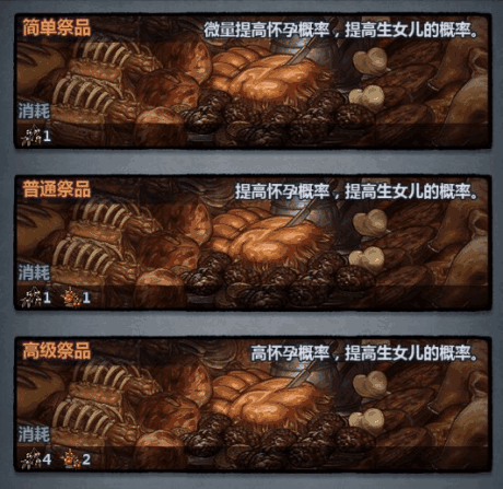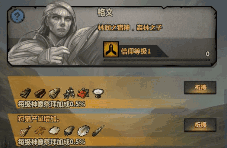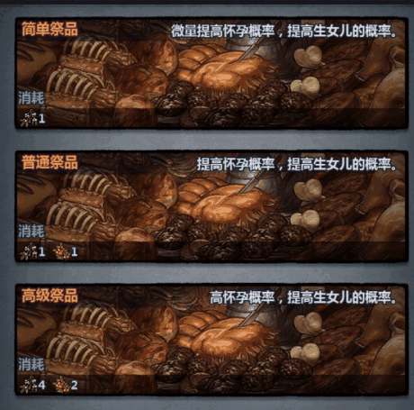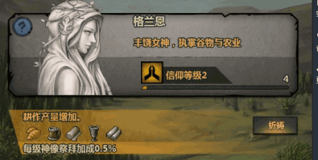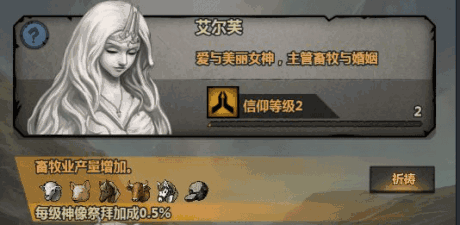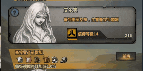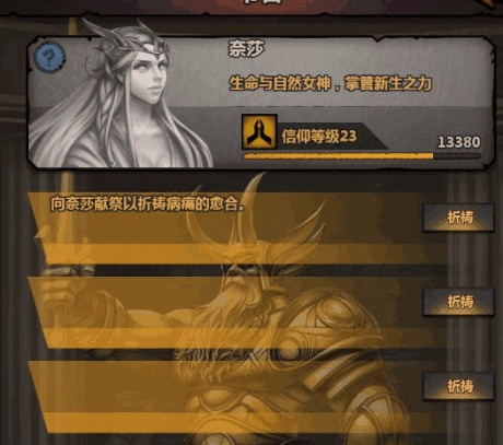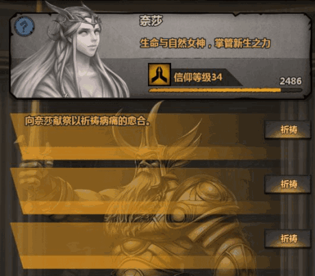 奈莎有三个功能,第一个是治疗病痛,通过祈祷可以有几率恢复,根据其他的贡品啊还 神像的等级效果不一样,第二个是原本增加寿命的,第三个增加女儿生育率的。如下图
