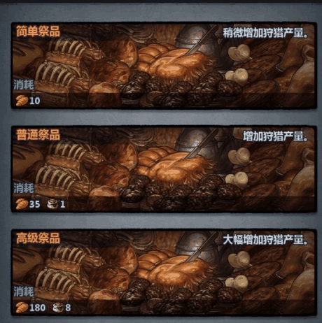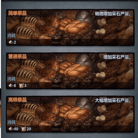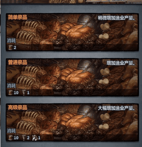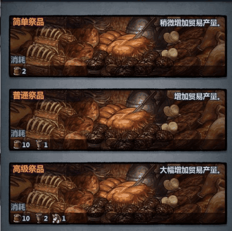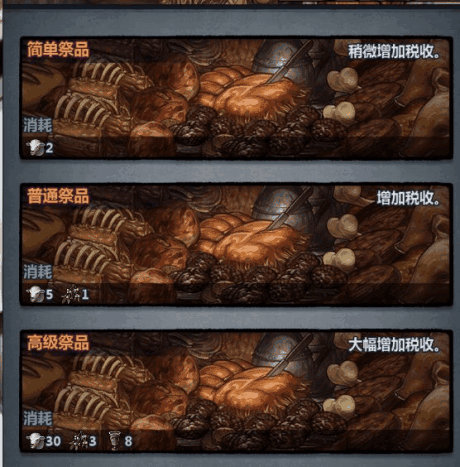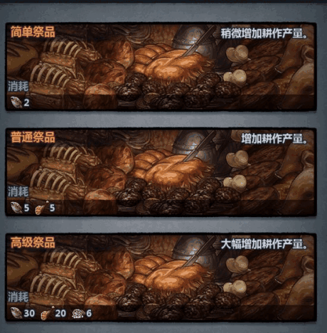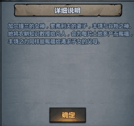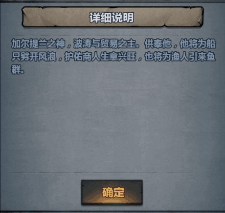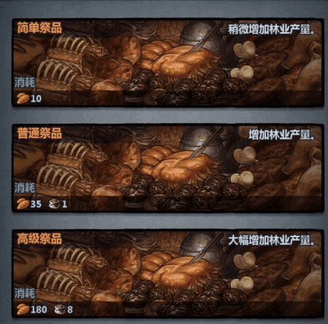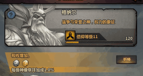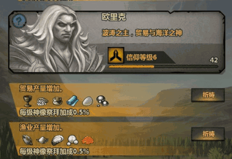 以上这7个神是在八月份的丰收节可以祈祷的,其中初始等级是1级加成是0.5,这个产量是影响到你所占了的对应资源每年的产量,通过祈祷增加对应年的,第二页影响市场的一定产量,比如我之前却金精,我的市场正常每年产4个,但是祈祷后可以买5个。一些高级商品在市场里面是有一定数量限制每年购买限制额度,其中格纳尔是影响税收的。当然还有一个在十一月的亡人节这个功能有点多,但是目前好像可能有变动,但是还是来讲一下吧。