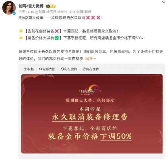 剑网3装备修理费永久取消了吗 剑网3装备修理费永久取消介绍
