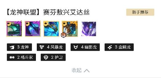 这次给大家带来的敖兴阵容叫龙神联盟,顾名思义就是大部分都由龙神棋子组成的,他们分别是金鳞龙神·艾达丝、幽影龙神·赛芬、山隐之焰·奥恩、星界龙神·敖兴、魂锁典狱长·锤石,最终组成的羁绊为三龙神(当场上有龙神时,会直接占据两个位置,并且自身还会获得七百点生命值,这个效果只会作用于一个龙神,因为这个阵容中有三个龙神,所以该羁绊也就直接失效了)。