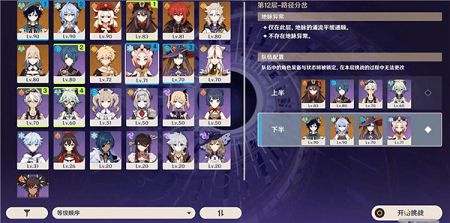 从上面怪物的分布可以看出12层的上半层基本都是单体输出较高的boss,所以使用这个队伍可以利用行秋挂水配合胡桃打融化反应可以快速的瓦解怪物血量。钟离加护盾和场控来给胡桃创造输出的空间和生存能力,班尼特加血和充能保证胡桃和行秋的大招能够快速释放。