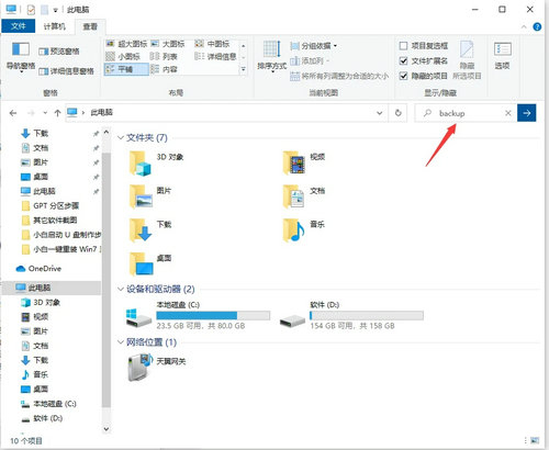 3、在此电脑界面的右上角搜索框中输入Backup进行搜索,界面就会显示出关于Backup的文件夹,这个文件夹就是备份文件夹的位置啦