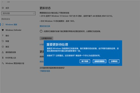 在“Windows 更新”中点击“检查更新”,系统会自动下载并安装更新(在更新列表中可以看到“针对Windows 10的功能更新,版本1803”这一项)。