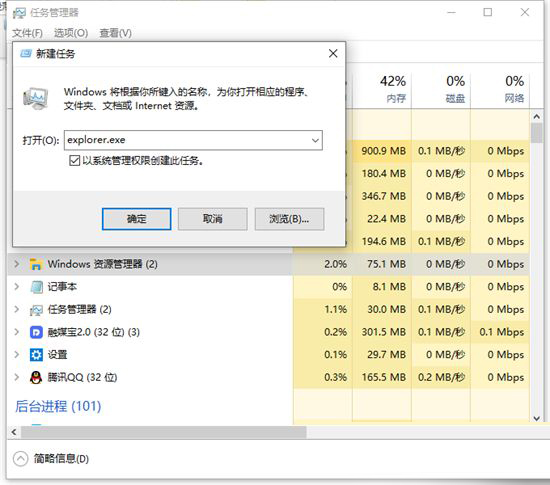 4、新建任务窗口中输入explorer.exe,确定运行即可修复。