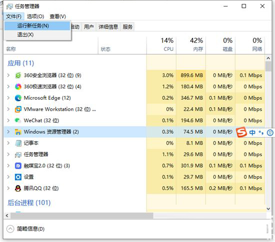 3、继续打开任务管理器,找到并点击左上角“文件”,选择“运行新任务(N)”。
