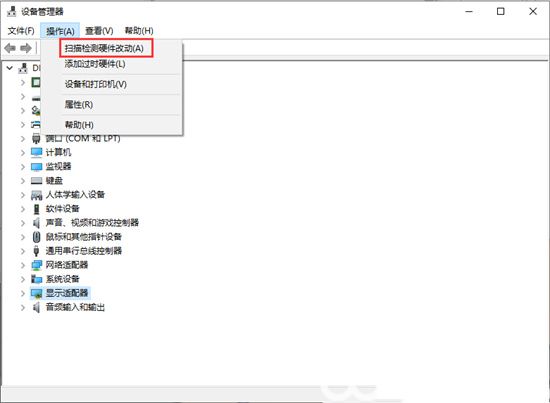 5、显卡驱动卸载完成后,设备管理器窗口中,点击操作菜单,在打开的下拉项中,选择扫描检测硬件改动(A)。