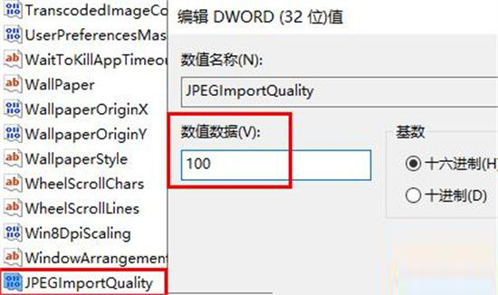 4、然后将其命名为“JPEGImportQuality”,并双击打开,最后将窗口中的“数值数据”改为“100”,点击“确定”保存即可。