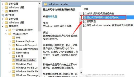 5、鼠标点击Windowslnstaller,点击右侧的“阻止从可移动媒体进行任何安装”。