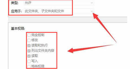 4、在打开的页面中,对于文件夹的访问权限类型改为允许,并且将下方的基本权限进行勾选,然后保存设置即可。