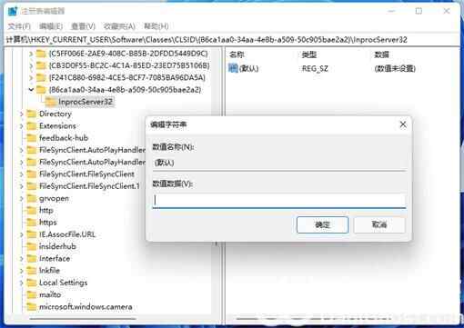 5、击InproServer32后,在右侧的默认名称上,双击,弹出编辑字符串窗口,数值数据留空不填写,直接点击确定保存即可;
