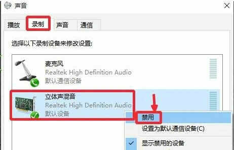 8、如果里面有“立体声混音”,我们在该选项上单击右键,点击“禁用”;