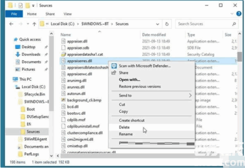 在安装windows11系统的过程中,如果提示电脑配置不满足,我们只需要删除一个文件就可以绕过所有硬件的限制。首先下载好win11系统镜像后,在电脑上打开文件资源管理器,然后定位到C:\$WINDOWS.~BT\Sources文件夹,在这里找到appraiserres.dll文件并把其删除,接下来返回到安装界面,点击后退按钮,再点下一步就可以正常升级Windwos11系统了。