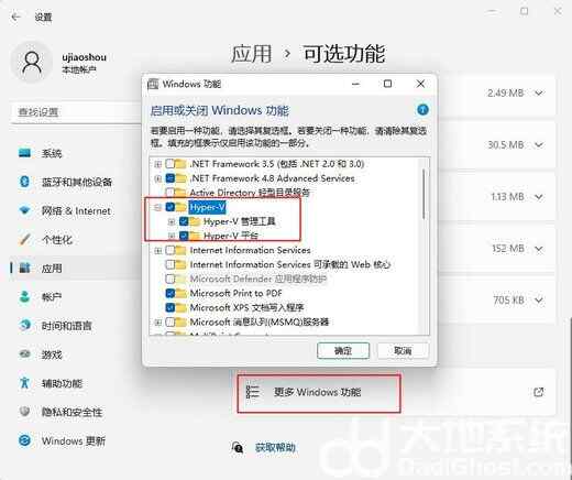 1、依次点击开始—设置—应用—可选功能—更多windows功能,找到“Hyper-V”,勾选上。