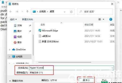 2、复制以下命令粘贴进去。左上角点击文件—另存为,保存类型选择所有文件,文件名为Hyper-V.cmd,点击保存。