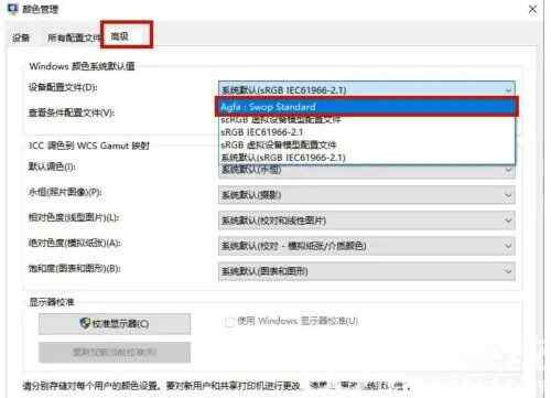 3、在颜色管理功能中点击“高级”这个菜单,然后将“设置配置文件”选项改为“Agfa:Swop Standard”;