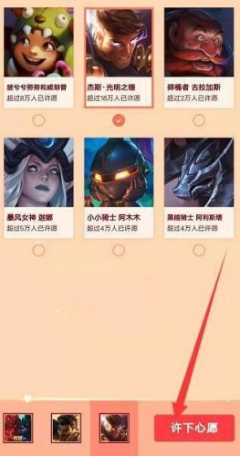 5、进入到选择英雄皮肤界面,选择自己需要的英雄皮肤,点击许下心愿即可。