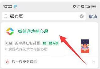 1、打开微信,在最上方的搜索栏里输入“微信游戏摇心愿”。