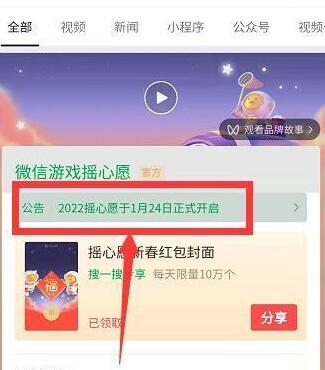 2、点击进入后,点击“2022摇心愿1月24日正式开启”。