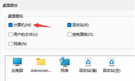 5、进入桌面图标设置,就可以看见各种桌面图标了,勾选“计算机”,保存即可。