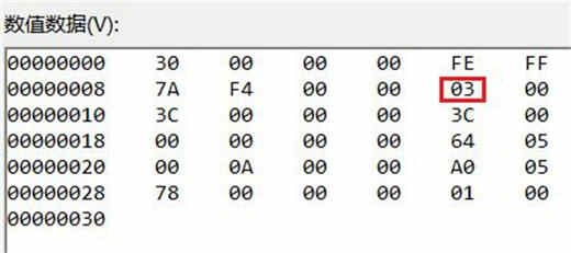 5、然后找到“00000008”一行,“FE”一列下的数值,将它改为“00”即可。