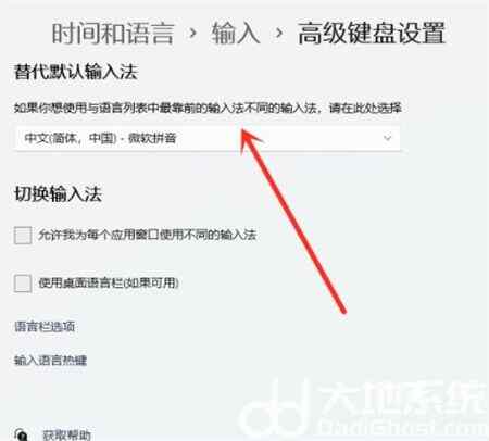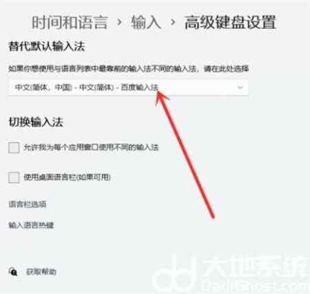 4、进入【高级键盘设置】界面,点击顶部的下拉选框,即可选择你想要的默认输入法了。