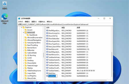 3、进入注册表后,在地址栏中输入:HKEY_CURRENT_USER\Software\Microsoft\ Windows\CurrentVersion\Explorer\Advanced\