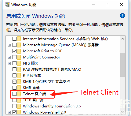 4、在Windows功能中,勾选【Telnet Client】,然后点击确定。