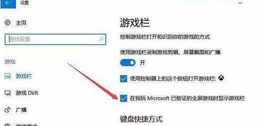 6、在打开的游戏设置窗口中,点击左侧边栏的“游戏栏”菜单项,在右侧窗口中找到“在我玩Microsoft已验证的全屏游戏时显示游戏栏”一项,去掉前面的勾选,最后点击确定按钮。这样以后再玩全屏游戏时,也不会再卡了。