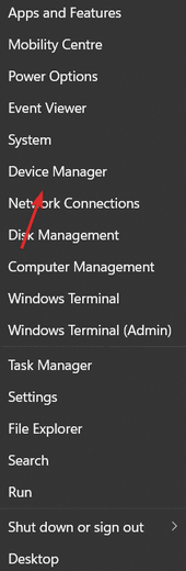 右键单击任务栏中的开始图标,然后选择设备管理器。