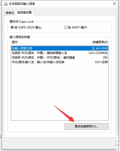 7、在“高级键设置”界面就可以看到常用的输入法相关的切换切换按键,这里我们以切换输入法为例:先点击选中“在输入语言之间”再点击下方的“更改按键顺序”。