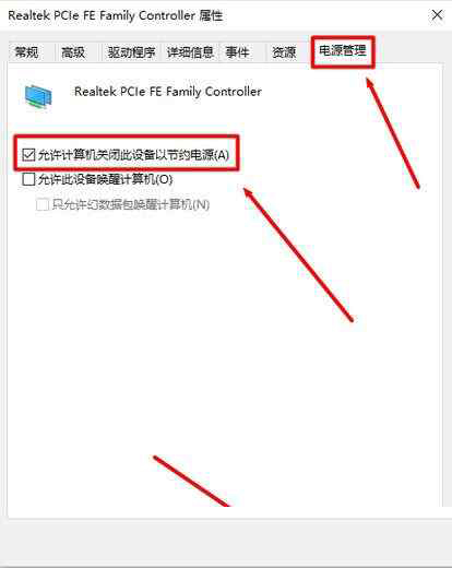 3、最后,打开电源管理,取消允许计算机关闭此设备以节约电源却可