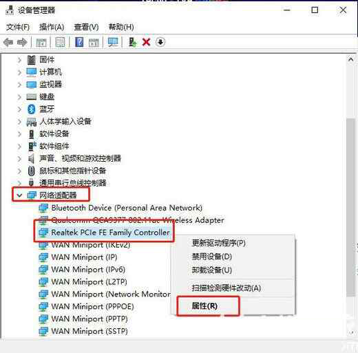 2、在设备管理器界面中,下拉找到并点击网络适配器项,然后鼠标右键点击笔记本电脑使用的网卡驱动,选择属性项