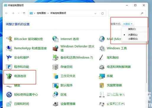 2、在控制面板窗口中,查看方式选择大图标,找到“电源选项”,点击进入。