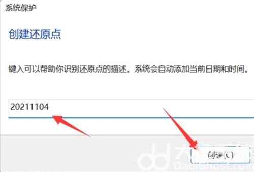 6.在弹出的窗口中我们输入还原点的名称,完成后点击下方的创建按钮。
