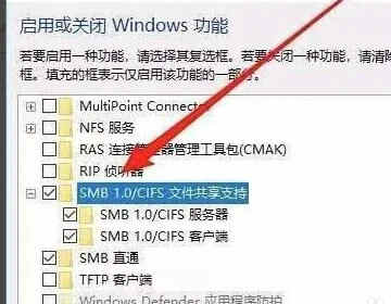 4、最后在窗口中勾选“SMB 1.0/CIFS文件共享支持”前面的复选框,把其下面所有的勾选全部选中即可完成了。
