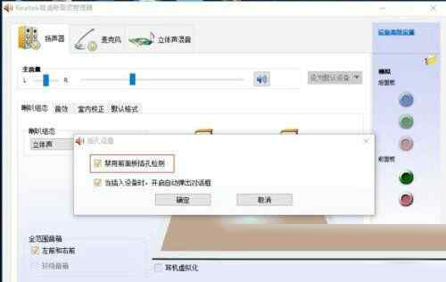 一般情况下大家给电脑插上耳机设备的时候都会弹出提示,但是有的win10用户反映耳机插上电脑没有弹出对话框,这种情况怎么办呢?如果确保耳机没有问题的话,你可以使用驱动软件来重装声卡驱动,如果依然不行的话,那就打开Realtek高清晰音频管理器,点击插孔设置,然后勾线“禁用前面板插孔检测”即可。