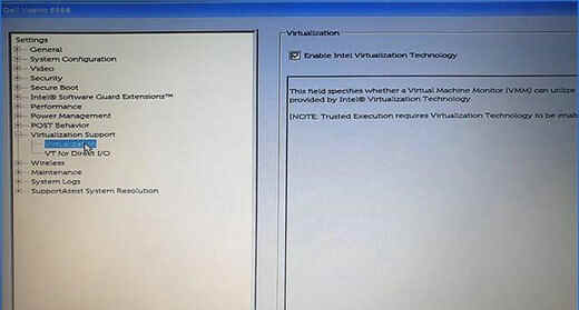 5、戴尔笔记本电脑按F2进bios,有“虚拟化支持”(Virtualization Support)部分。勾选Enable Intel Virtualization Technology,按F10保存重启。